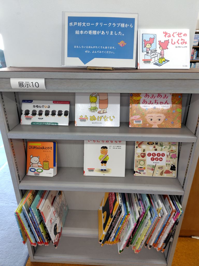 この度、水戸好文ロータリークラブ様から、子どもたちに楽しんでもらうため、たくさんの絵本の寄贈がありました。 中央図書館児童室で、展示しています。 おもしろい本がたくさんあります。 どうぞご利用ください。